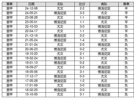 博洛尼亚 VS 尤文两队近10年的交战次数为20场,博洛尼亚0胜6平14负,赢球概率为0.0%,平局概率为30.0%,输球概率为70.0%。