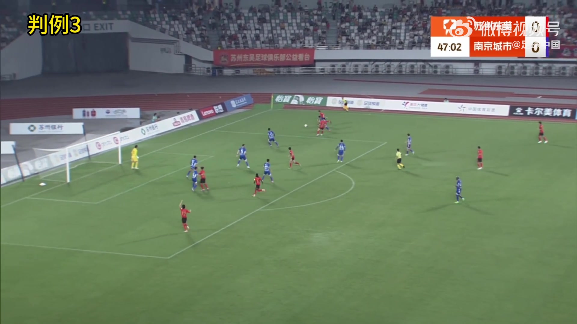 判例三:中甲联赛第24轮,苏州东吴vs南京城市。比赛第48分钟,苏州东吴6号队员头球射门,南京城市守门员将球扑出,助理评判员涌现球的举座如故逾越球门线,评判员判苏州东吴队进球得分。