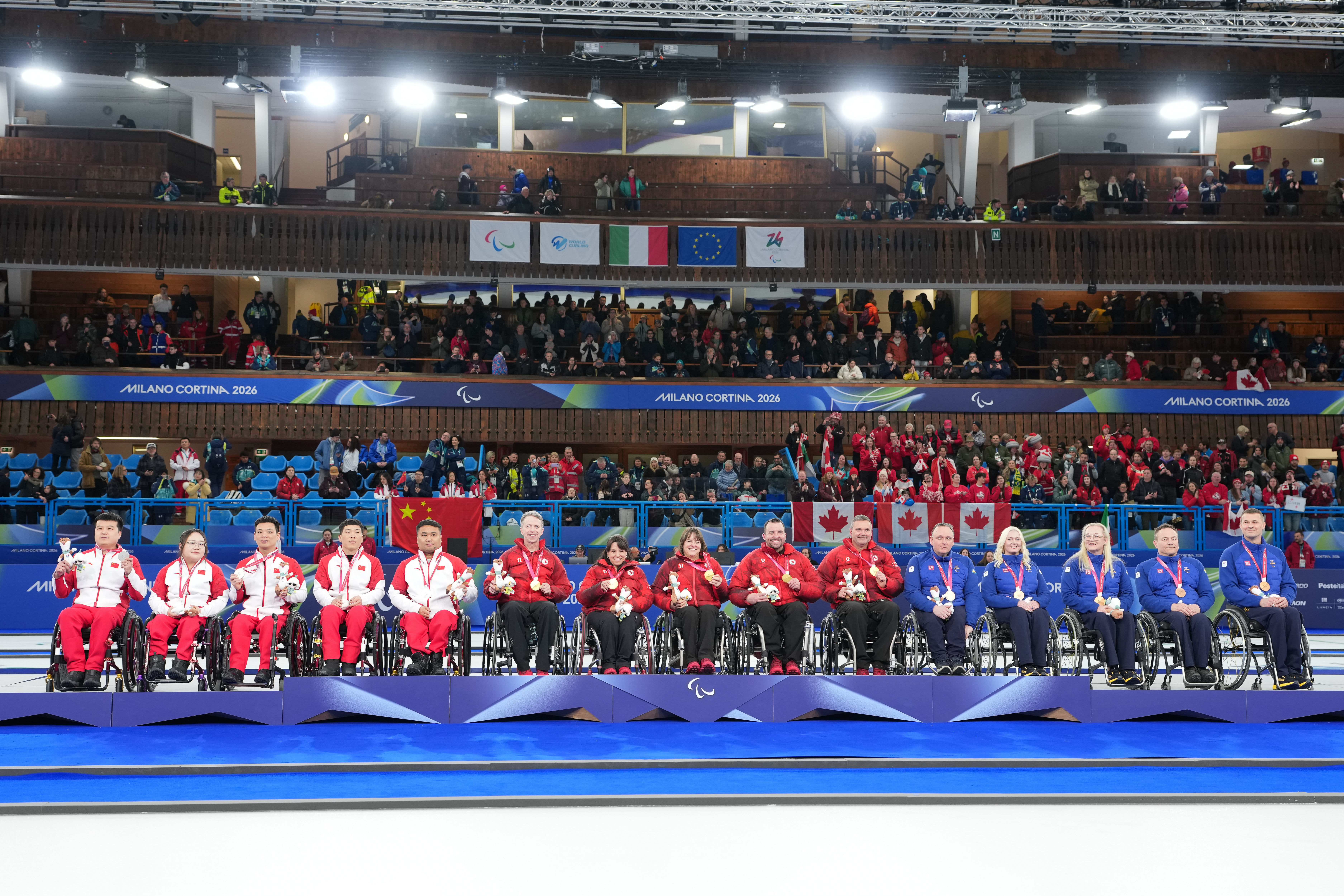 3月14日,亚军中国队(左)、冠军加拿大队(中)和季军瑞典队在授奖庆典上。新华社记者 连漪 摄