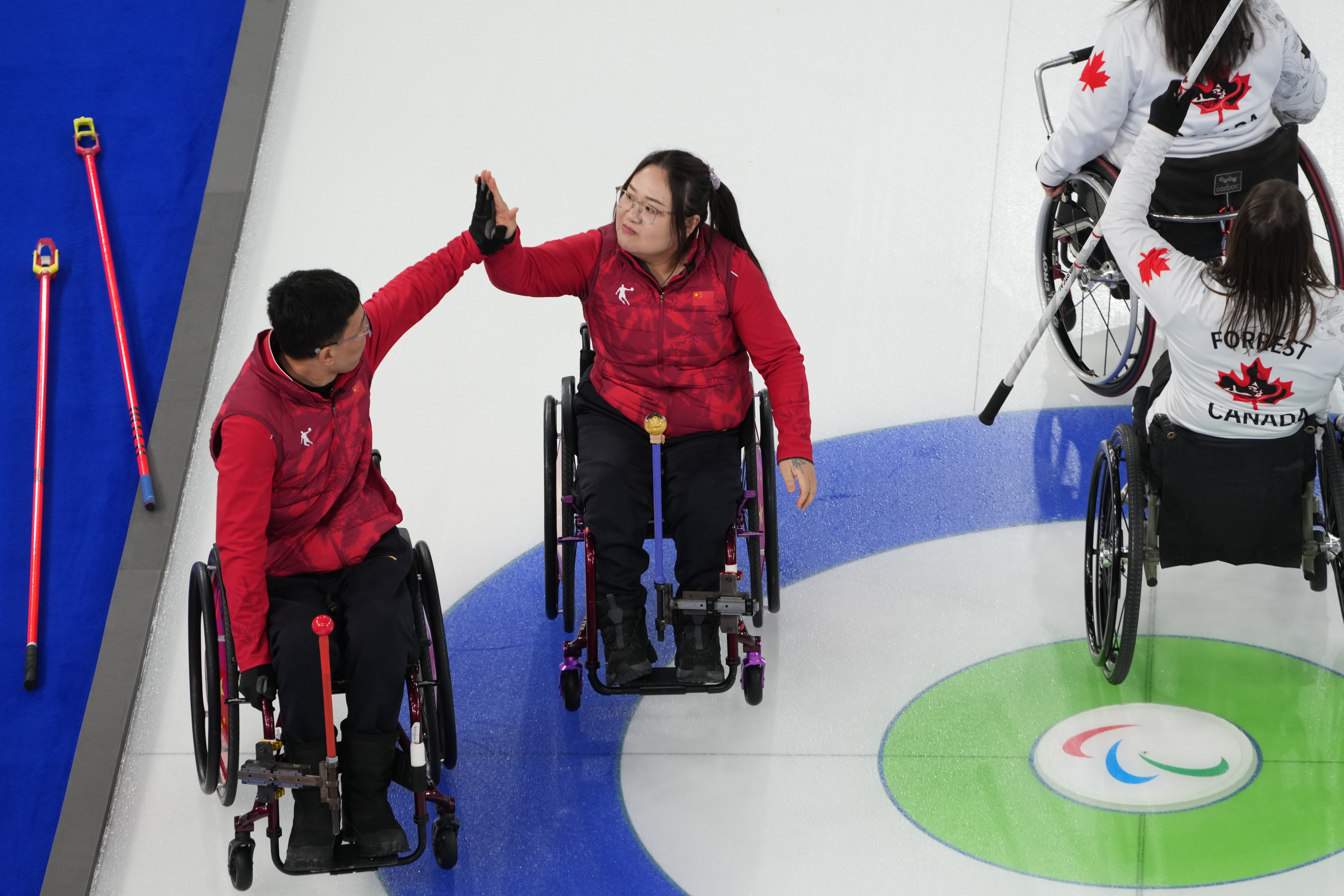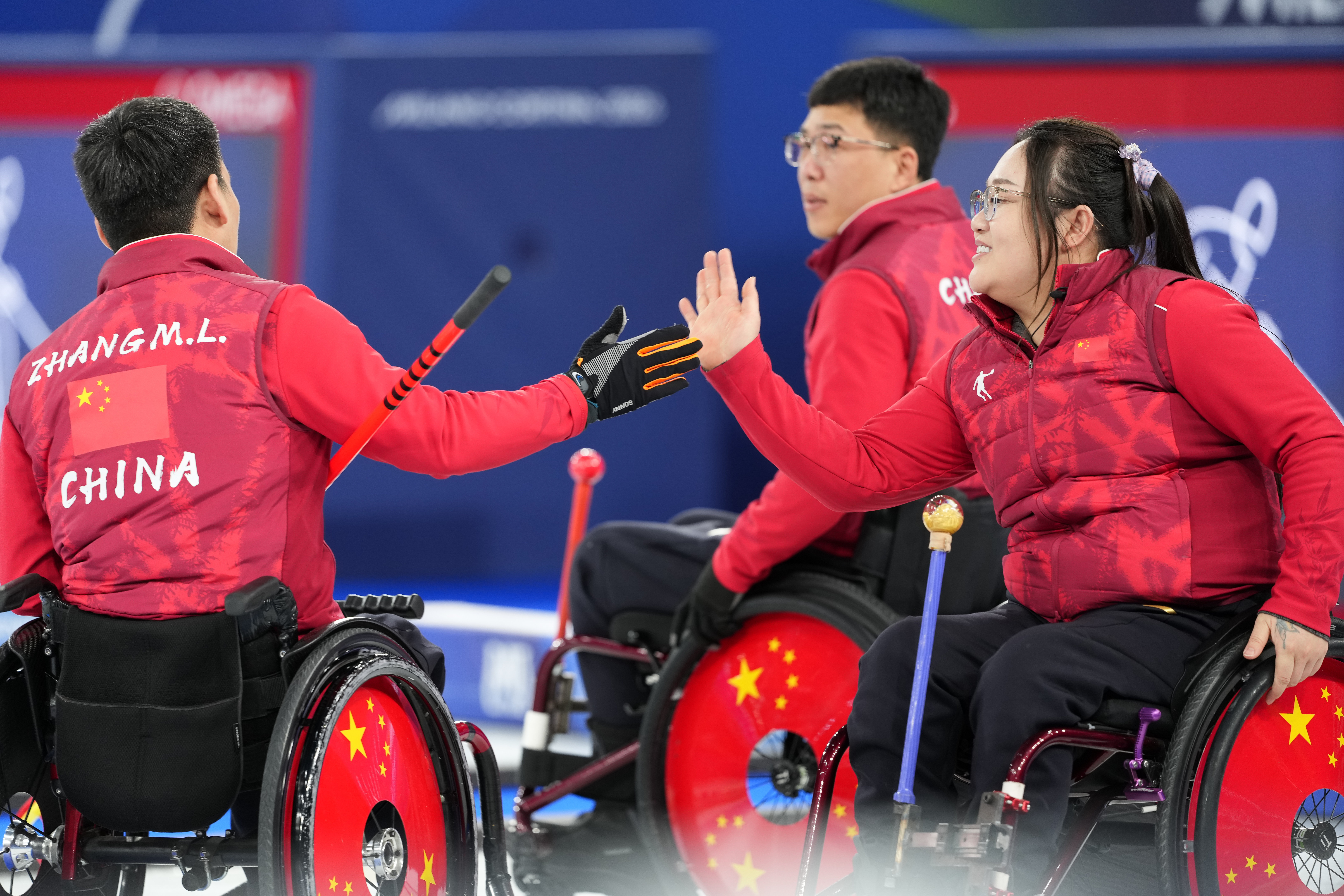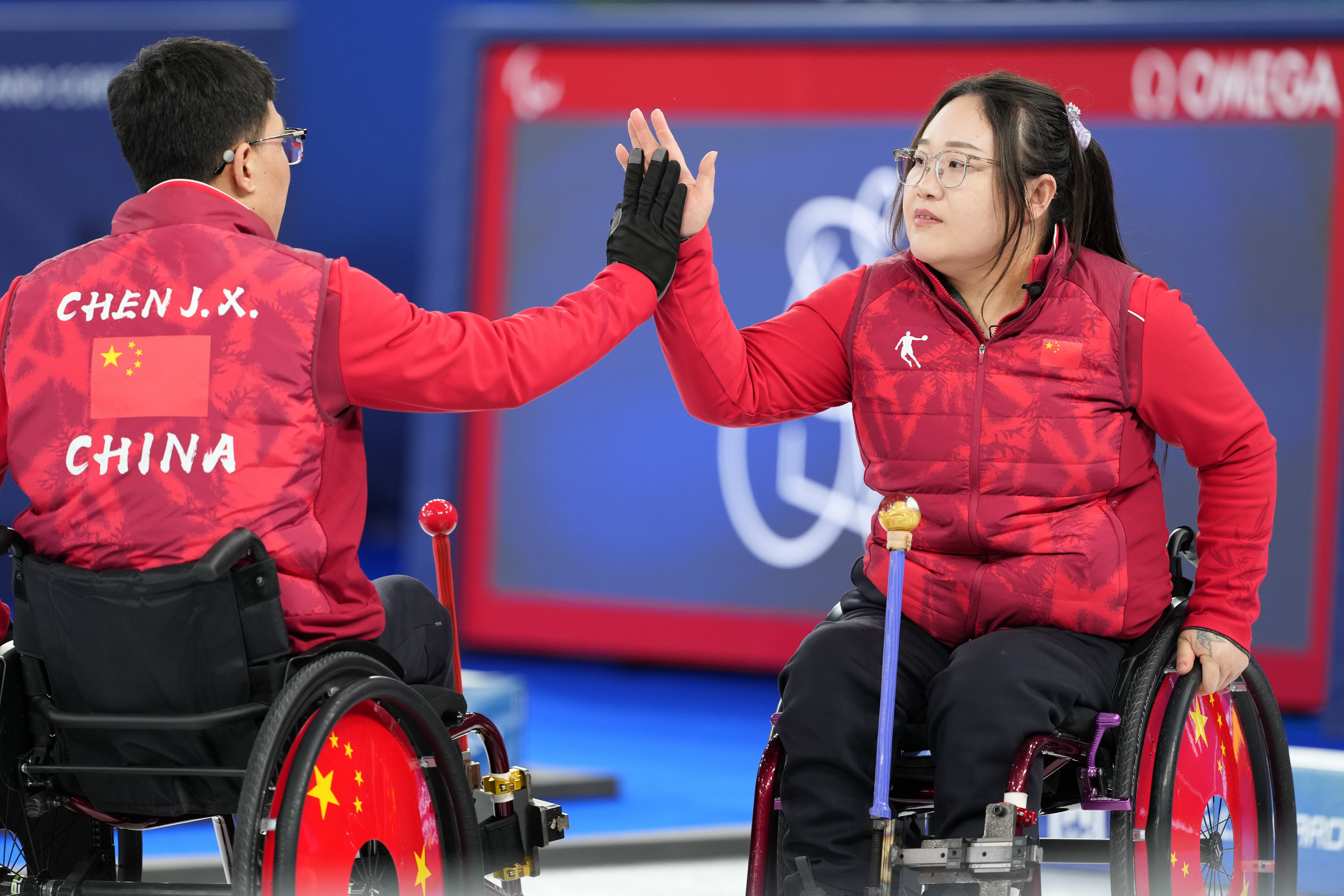 3月14日,中国队选手李娜娜(右)在比赛中与队友张亮堂击掌。新华社记者 连漪 摄