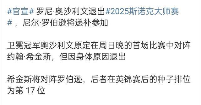 2025年1月11日,宇宙台联官宣,奥沙利文作念出紧要决定,主动肃清各人赛的阅历,让给另一位球员罗伯逊,从退出冠军联赛到各人赛弃权,讯息传来照实让东说念主不测,但这种事不是初次发生。
