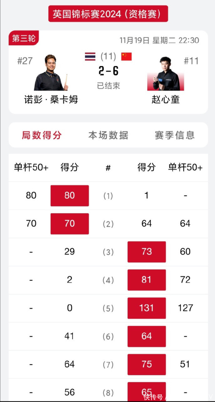 英锦赛资历赛第一轮,赵心童以6-3淘汰泰国选手阿卡尼-宋沙瓦,第二轮以6-3校服江俊,第三轮又校服泰国选手诺鹏-桑坎姆,第四轮又以6-2的比分强势晋级正赛。