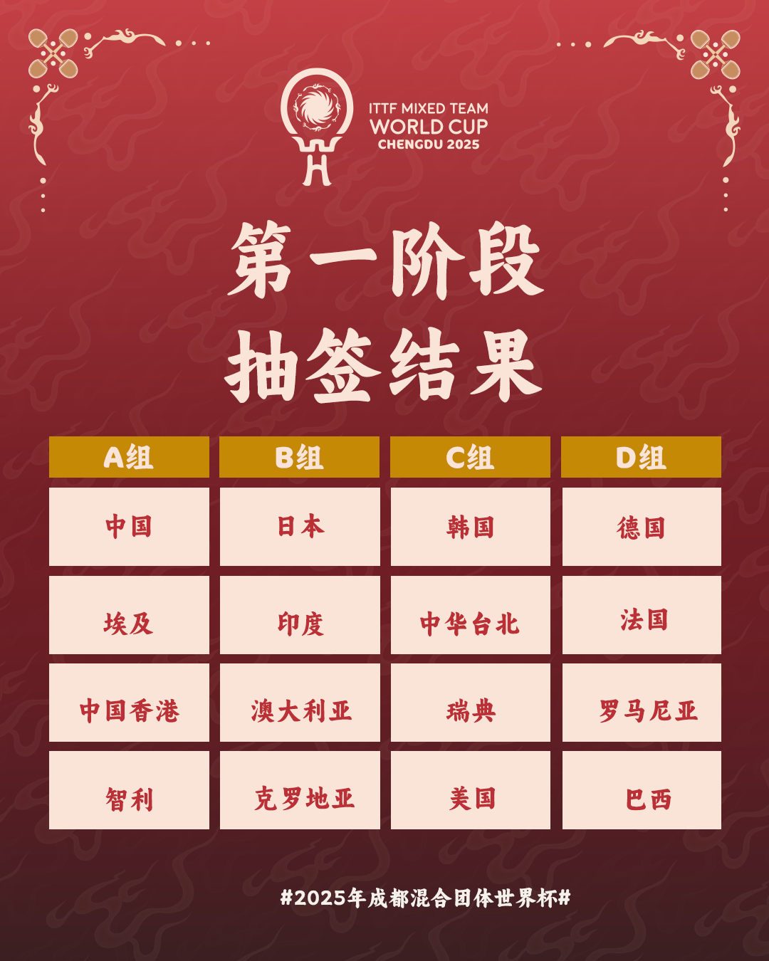 2025年景齐国外乒联羼杂团体寰球杯由中国电信呈献(简称:2025年景齐羼杂团体寰球杯),将于11月30日至12月7日在四川省体育馆举办。冠部队将得到2500点寰球排行积分。第一阶段抽签成果如下: